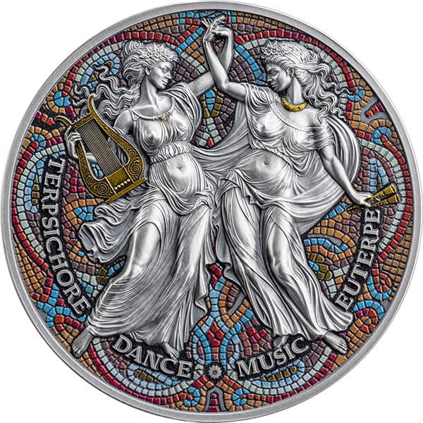 Ζήστε τη διαχρονική έμπνευση της Τερψιχόρης και της Ευτέρπης μέσα από αυτό το υπέροχο συλλεκτικό νόμισμα των 2 oz από την παγκοσμίου φήμης σειρά οι 9 Μούσες Οι δύο ευγενείς Μούσες της αρχαίας ελληνικής μυθολογίας προσωποποιούν την καθαρή δημιουργική έκφραση Τερψιχόρη, η Μούσα του χορού και των χορικών μελωδιών, απεικονίζεται με τη λύρα της, έτοιμη να καθοδηγήσει το ρυθμό και την κίνηση Ευτέρπη, η Μούσα της μουσικής και της λυρικής ποίησης, κρατά το φλάουτό της, πηγή μελωδιών γεμάτων συναίσθημα και αρμονία.